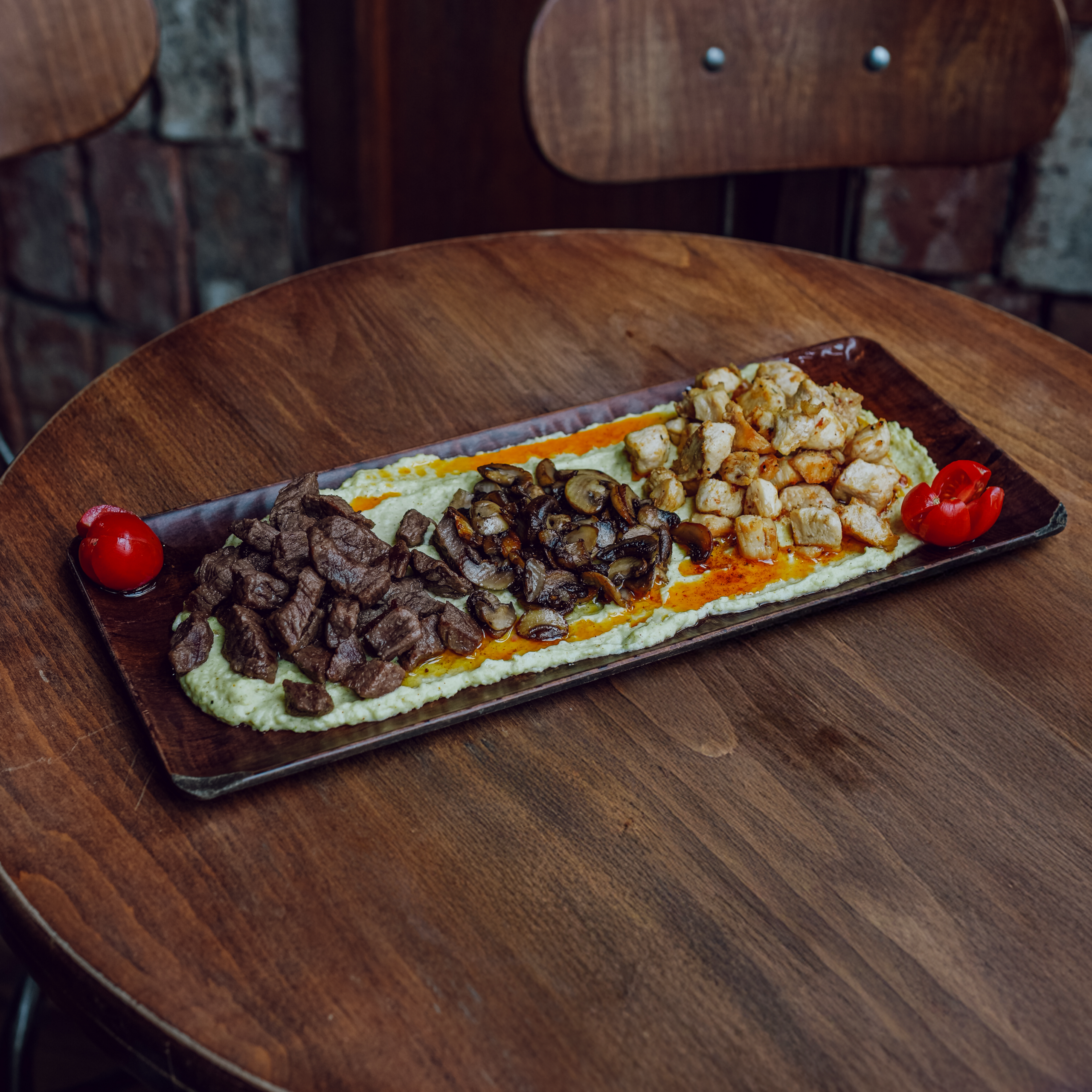 200 gram mish i bardhë, 200 gr mish i kuq, Këpurdha dhe pure të patateve me curry